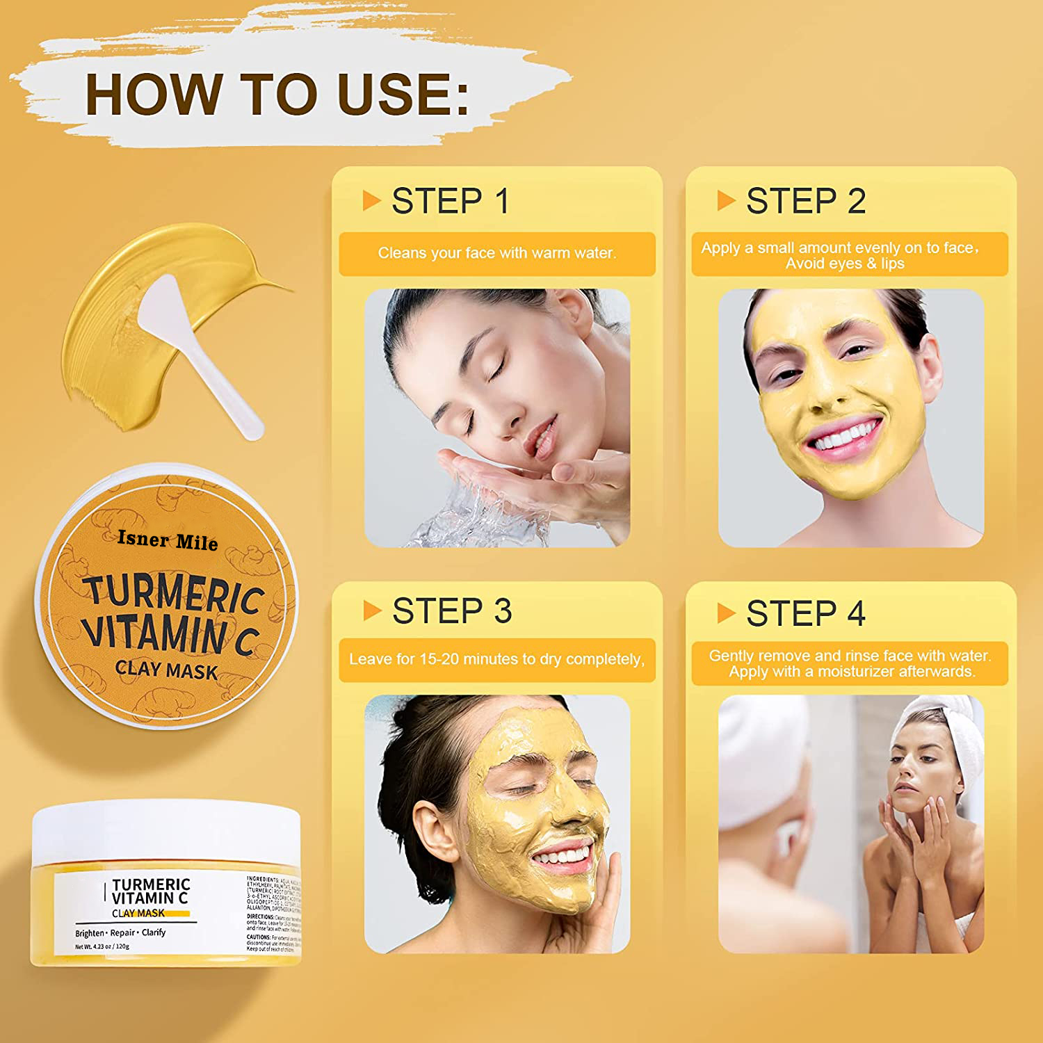 Boost Skin Radiance -- A clay facial mask made of turmeric, Vitamin C and kaolin clay. Anairui Turmeric Vitamin C clay mask for acne & dark spots, a effective vegan-based formula mask helps reduce blemishes and pigmentation, address problems of uneven skin tone and dullness of skin. Super-food Facial Mask -- riches in stable form of Vitamin C and E, this turmeric face mask revitalize skin, and brightens and restores radiance, inhibiting the formation of black spots, also help fights emerging signs of aging like sagging skin, lines and wrinkles. Acne Treatment Mask -- This vitamin c clay mask with turmeric contains Niacinamide and Honey, also help hydrate, nourish skin, prevent your skin from acne breakouts, these antioxidants help improve skin radiance and evenness in a natural way. Pore Cleansing & Hydrating -- Our turmeric vitamin C clay mask is a deeply cleansing purifying mask that helps remove blackheads, excess oil, toxins, dirt, purify and minimize pores, while hydrating our skin for a smooth, supple feel in 15 minutes.