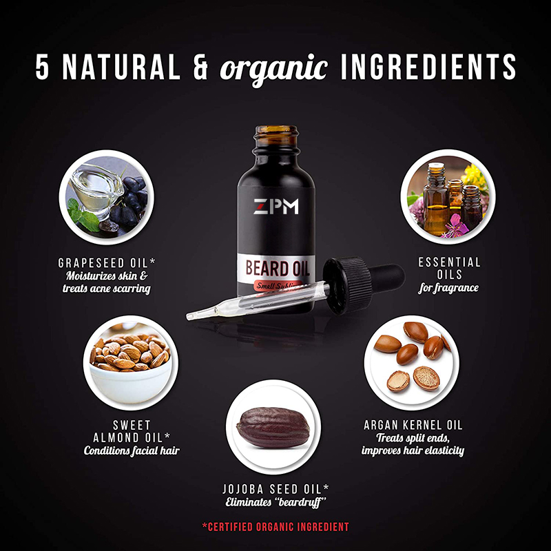 Ingredients Organic Grape Seed Oil, Organic Sweet Almond Oil, Organic Jojoba Seed Oil, Argan Kernel Oil, Fragrance (Essential Oil Blend) Directions Squeeze a half to full dropper of beard oil in your palm depending on beard length. Spread it on both palms and rub evenly throughout your beard. If possible, use a beard brush for 60 to 90 seconds to fully distribute the oil throughout your beard. Enjoy your soft lustrous and sublimely scented facial hair!